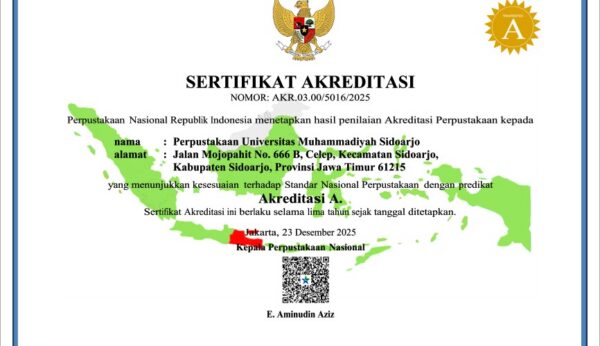 Sidoarjo – Perpustakaan Universitas Muhammadiyah Sidoarjo (UMSIDA) kembali menegaskan komitmennya dalam menjaga kualitas layanan dengan berhasil meraih Akreditasi A dari Perpustakaan Nasional Republik Indonesia. Pencapaian ini menjadi bukti bahwa Perpustakaan UMSIDA mampu mempertahankan standar unggul sesuai dengan Standar Nasional Perpustakaan. Berdasarkan Sertifikat Akreditasi Nomor AKR.03.00/5016/2025, Perpustakaan Nasional Republik Indonesia menetapkan bahwa Perpustakaan UMSIDA telah memenuhi seluruh indikator penilaian dengan predikat tertinggi, yaitu Akreditasi A . Sertifikat ini berlaku selama lima...Read More