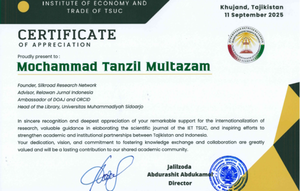 library.umsida.ac.id – Kabar membanggakan datang dari Universitas Muhammadiyah Sidoarjo (UMSIDA). Direktur Perpustakaan UMSIDA, Mochammad Tanzil Multazam, baru saja menerima Certificate of Appreciation dari Institute of Economy and Trade of Tajik State University of Commerce (IET TSUC), Tajikistan. Penghargaan ini diberikan sebagai pengakuan atas peran Tanzil dalam mendukung pengembangan jurnal ilmiah dan memperkuat jejaring akademik antara Indonesia dan Tajikistan. Melalui kerja sama tersebut, diharapkan pertukaran pengetahuan lintas negara semakin berkembang dan...Read More