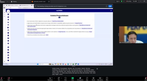 Sidoarjo – Perpustakaan Universitas Muhammadiyah Sidoarjo (UMSIDA) kembali menyelenggarakan kegiatan Online Literacy Class (OLC) sebagai bagian dari komitmen dalam mendukung peningkatan kualitas akademik mahasiswa. Kegiatan ini dilaksanakan pada Jumat, 13 Februari 2026 pukul 13.00 WIB secara daring dan diikuti oleh mahasiswa dari berbagai program studi. OLC menghadirkan Pristiwanto, A.Md., Pustakawan UMSIDA, sebagai narasumber yang membimbing peserta untuk lebih mengenal dan memanfaatkan layanan serta fasilitas perpustakaan secara optimal. Dalam sesi ini,...Read More