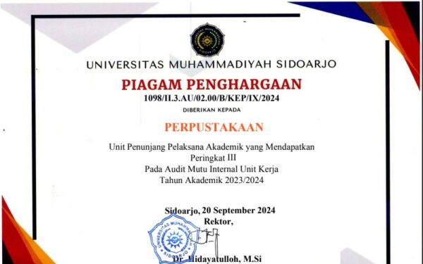 Sidoarjo – Perpustakaan Universitas Muhammadiyah Sidoarjo (UMSIDA) kembali menorehkan capaian membanggakan dengan meraih Juara III Unit Kerja Berkinerja Terbaik pada pelaksanaan Audit Mutu Internal (AMI) Tahun Akademik 2023/2024. Penghargaan ini ditetapkan melalui Surat Keputusan Rektor UMSIDA Nomor 1098/II.3.AU/02.00/B/KEP/IX/2024 tanggal 20 September 2024, serta diperkuat dengan piagam penghargaan resmi yang diberikan oleh Badan Penjaminan Mutu (BPM) UMSIDA. Penilaian dilakukan secara objektif terhadap seluruh unit kerja di lingkungan universitas, mencakup aspek kinerja...Read More