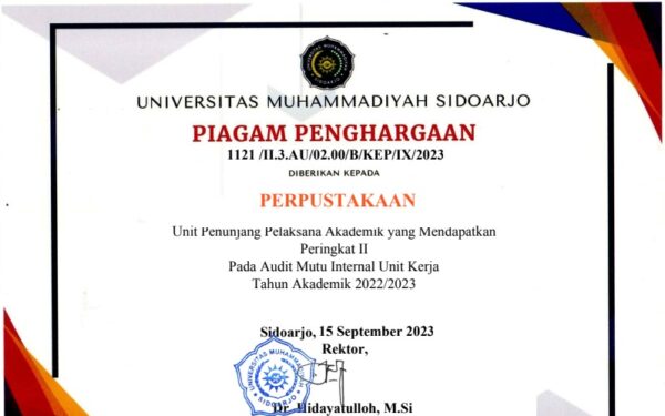 Sidoarjo – Perpustakaan Universitas Muhammadiyah Sidoarjo (UMSIDA) kembali menorehkan prestasi membanggakan dengan meraih penghargaan sebagai Unit Kerja dengan Kinerja Terbaik II pada pelaksanaan Audit Mutu Internal (AMI) Tahun Akademik 2022/2023. Penghargaan ini ditetapkan melalui Surat Keputusan Rektor UMSIDA Nomor 1121/II.3.AU/02.00/B/KEP/IX/2023 tertanggal 15 September 2023. Penilaian dilakukan secara menyeluruh terhadap berbagai unit kerja di lingkungan universitas, mencakup aspek mutu layanan, tata kelola, serta kontribusi terhadap pencapaian visi dan misi UMSIDA. Kepala...Read More