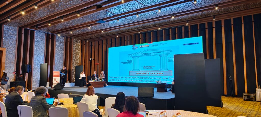 Materi yang disampaikan menekankan bahwa keberlanjutan Diamond Open Access tidak cukup hanya bertumpu pada prinsip keterbukaan, tetapi harus dibangun di atas sistem integritas yang kuat. Dalam presentasinya, ekosistem Diamond OA digambarkan sebagai bangunan pengetahuan yang ditopang oleh tiga unsur utama, yaitu integrity systems, structural funding, dan collaborative governance. Kerangka ini menegaskan bahwa kepercayaan publik terhadap komunikasi ilmiah harus ditunjang oleh mekanisme integritas yang nyata, terlihat, dan diterapkan secara konsisten.