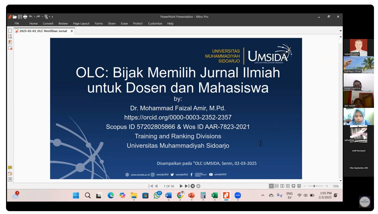 Sidoarjo, 3 Februari 2025 – Universitas Muhammadiyah Sidoarjo (UMSIDA), melalui Direktorat Perpustakaan, kembali menggelar Online Literacy Class (OLC) bertajuk Bijak Memilih Jurnal Ilmiah untuk Dosen dan Mahasiswa. Acara ini diselenggarakan sebagai bentuk kepedulian terhadap akademisi dalam memilih jurnal ilmiah yang berkualitas dan menghindari jurnal predator yang dapat merugikan.