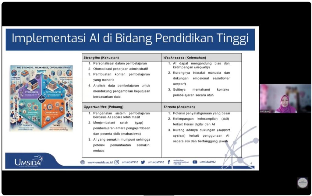 Perpustakaan UMSIDA kembali menyelenggarakan kegiatan akademik melalui program Online Literacy Class (OLC) yang berfokus pada penguatan literasi digital mahasiswa. Mengangkat tema penggunaan kecerdasan buatan (AI) yang selaras dengan standar etika publikasi ilmiah, kegiatan ini dilaksanakan secara daring pada Kamis, 9 April 2026 pukul 13.00 WIB dengan menghadirkan Dr. Andi Mardiana P., M.Pd. sebagai narasumber.