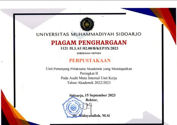 Sidoarjo – Perpustakaan Universitas Muhammadiyah Sidoarjo (UMSIDA) kembali menorehkan prestasi membanggakan dengan meraih penghargaan sebagai Unit Kerja dengan Kinerja Terbaik II pada pelaksanaan Audit Mutu Internal (AMI) Tahun Akademik 2022/2023.