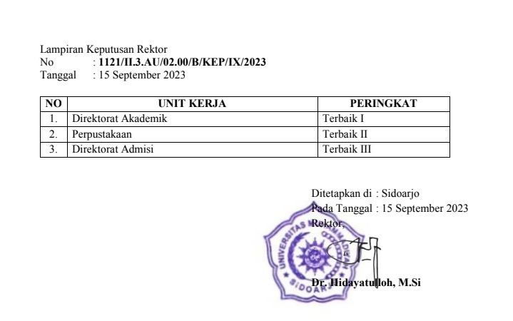 Penghargaan ini ditetapkan melalui Surat Keputusan Rektor UMSIDA Nomor 1121/II.3.AU/02.00/B/KEP/IX/2023 tertanggal 15 September 2023. Penilaian dilakukan secara menyeluruh terhadap berbagai unit kerja di lingkungan universitas, mencakup aspek mutu layanan, tata kelola, serta kontribusi terhadap pencapaian visi dan misi UMSIDA.