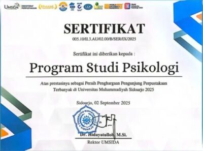 Perpustakaan Universitas Muhammadiyah Sidoarjo (UMSIDA) kembali menggelar program tahunan Pemustaka Aktif sebagai bentuk apresiasi kepada sivitas akademika yang menunjukkan partisipasi tinggi dalam memanfaatkan layanan perpustakaan. Pada periode Tahun Akademik 2024/2025, Program Studi Psikologi Fakultas Psikologi dan Ilmu Pendidikan (FPIP) dinobatkan sebagai Pemustaka Aktif dengan predikat Prodi Pengunjung Terbanyak. Penghargaan ini diberikan sebagai bentuk penghormatan atas kontribusi mahasiswa Psikologi dalam mendukung kegiatan literasi dan pengembangan budaya baca di lingkungan kampus.